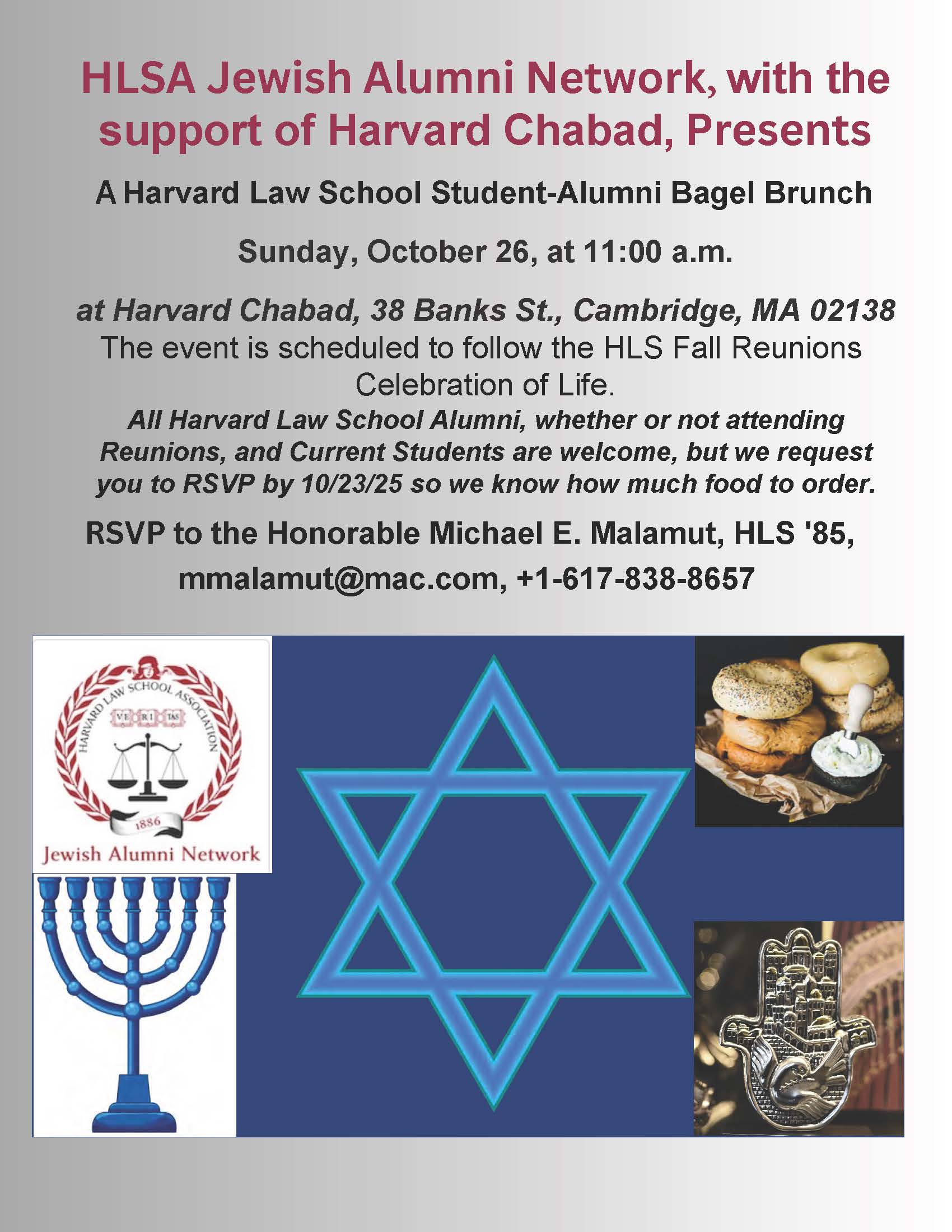 All Harvard Law School Alumni, whether or not attending Reunions, and Current Students are welcome, but we request you to RSVP by 10/23/25 so we know how much food to order.